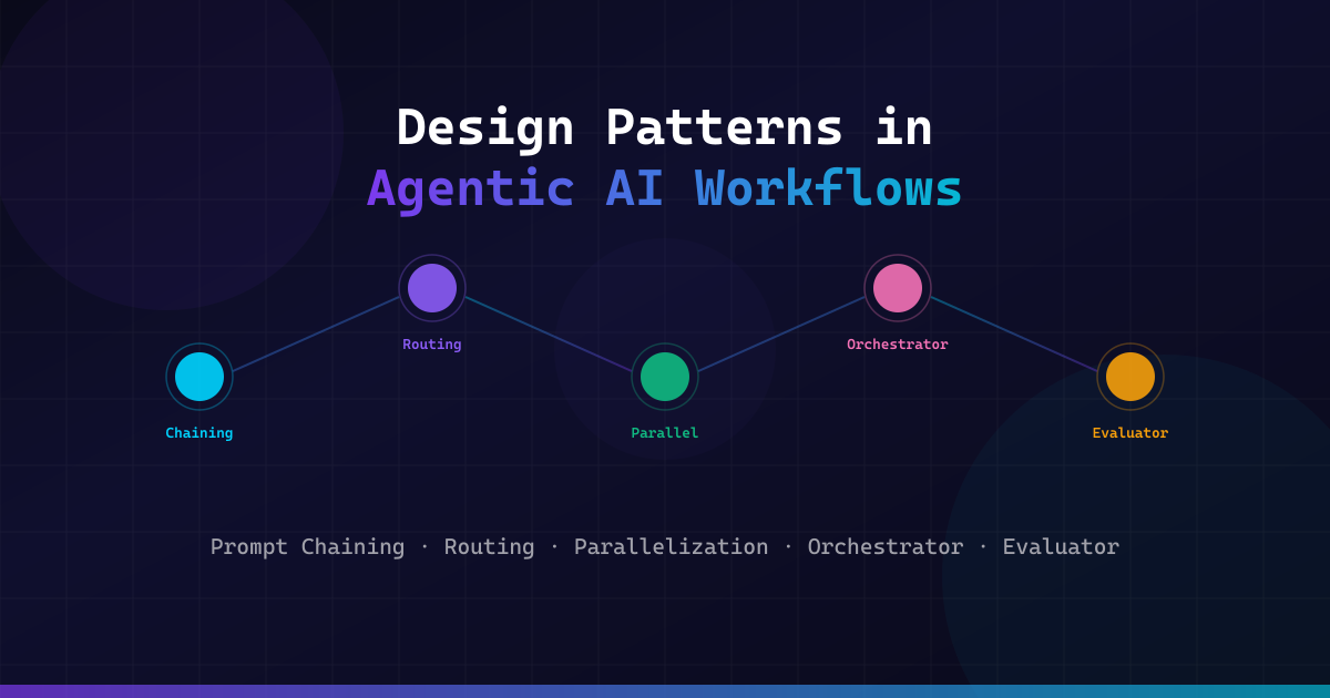 This article explores the five foundational design patterns that power modern agentic AI workflows: Prompt Chaining, Routing, Parallelization, Orchestrator–Workers, and Evaluator–Optimizer. Each pattern addresses a distinct challenge in building production-grade AI systems — from sequential reasoning to dynamic task delegation, concurrent execution, centralized coordination, and iterative refinement. We provide detailed Python implementations using LangChain, CrewAI, and the Transformers ecosystem, complete with error handling, type annotations, and async patterns that reflect real-world engineering standards.