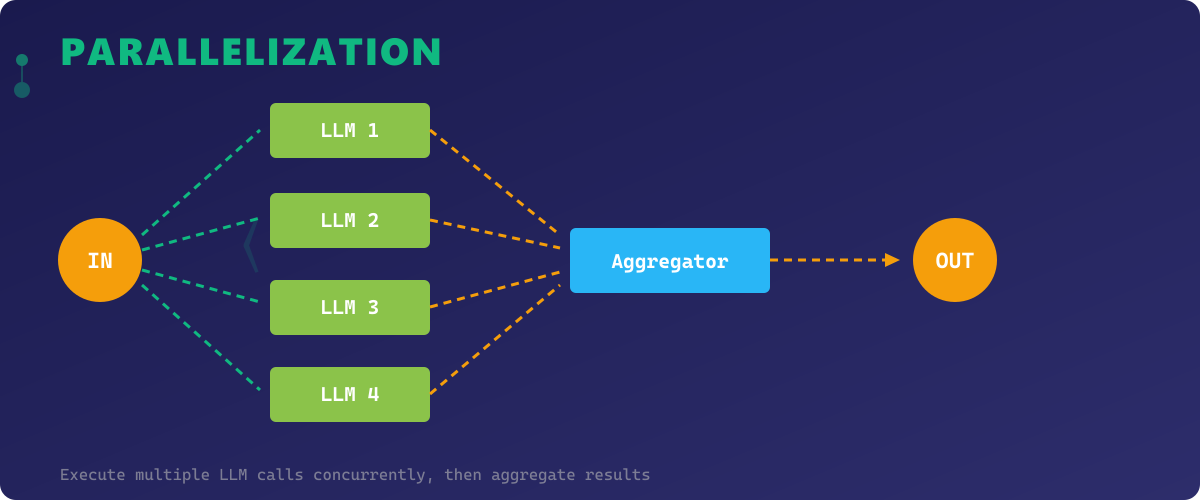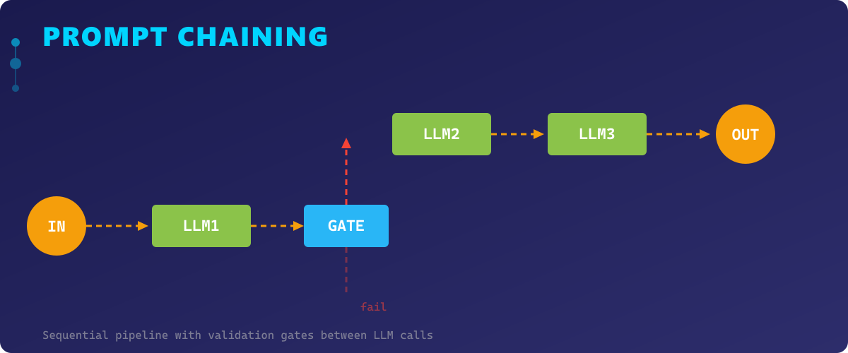 Prompt Chaining is the most intuitive pattern — it decomposes a complex task into a sequential pipeline where the output of one LLM call becomes the input of the next. Each step in the chain handles a focused subtask, making the overall system easier to debug, test, and iterate on.
